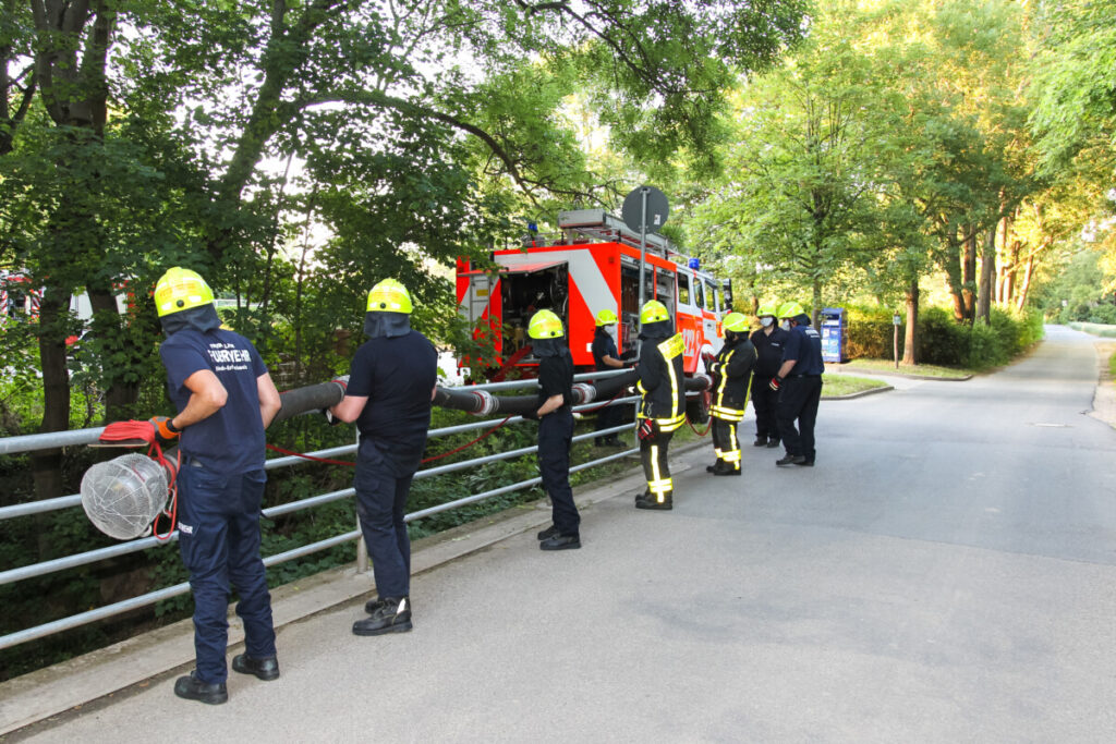 Am vergangenen Donnerstag nutzte die Einsatzabteilung das sommerliche Wetter zu einer Übung mit dem Thema „Wasserentnahme aus offenem Gewässer“. Geübt wurde am Sportplatz der TSG, die Wasserentnahmestelle war unser Erlenbach. Trotz Übungspause hat alles noch gut funktioniert und das Erlenbach-Wasser floss nach Aufbau der Entnahmevorrichtung mittels Saugschlauch durch unsere Schläuche.