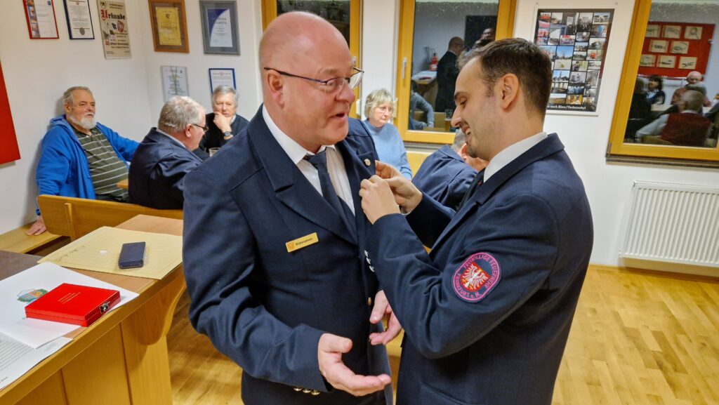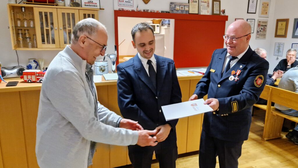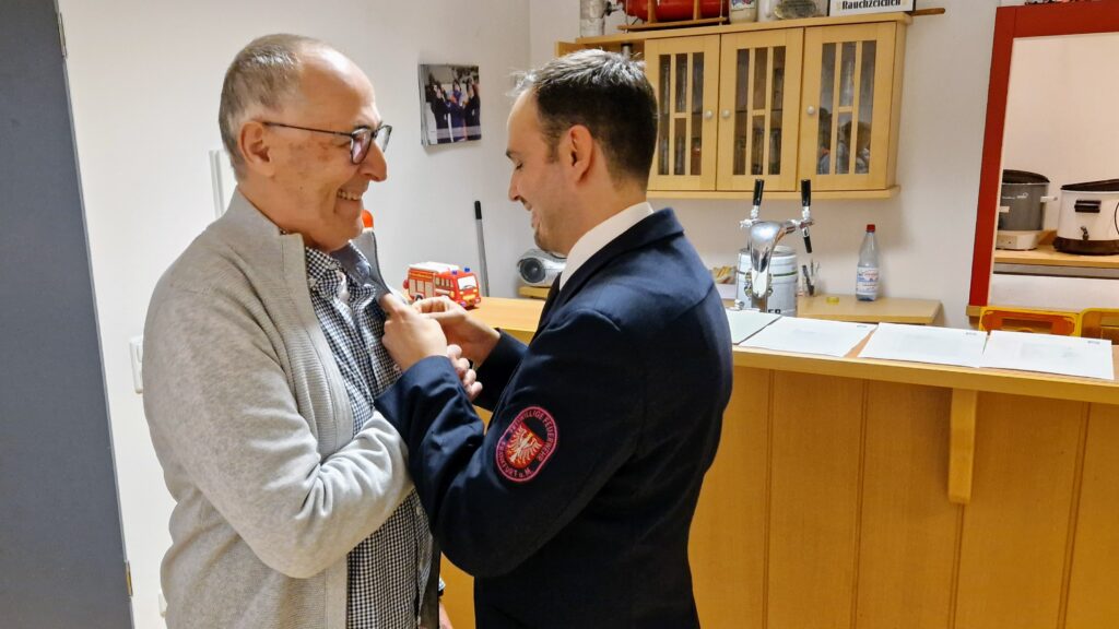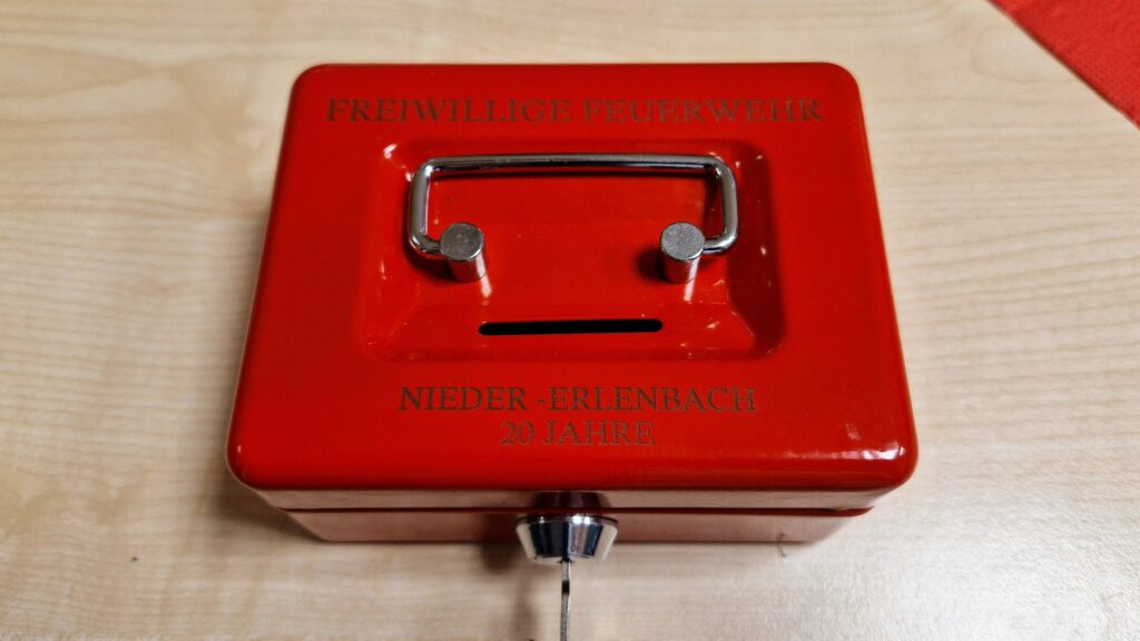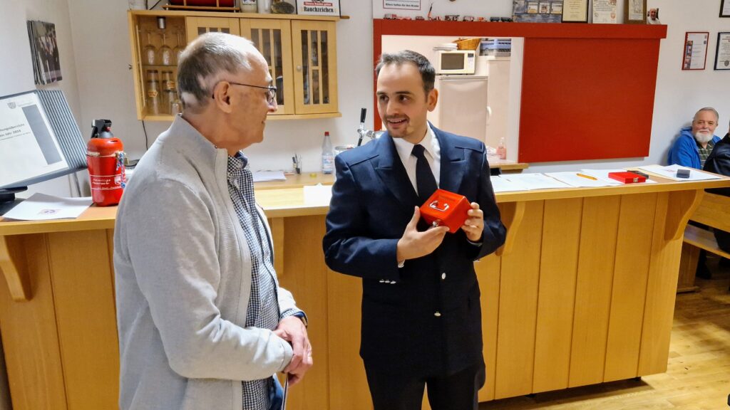 Zum Abschluss der Veranstaltung ehrte Hahn Theo Lenz für seine 20-jährige Tätigkeit mit der „Ehrenauszeichnung in Gold am Bande“ des Kreisfeuerwehrverbandes Frankfurt (KFV). Als Zeichen der Anerkennung und zur Erinnerung erhielt Lenz eine gravierte Kasse, gefüllt mit D-Mark Münzen aus dem Jahr 1998 – dem Jahr, in dem er seine Arbeit als Kassenwart aufnahm.