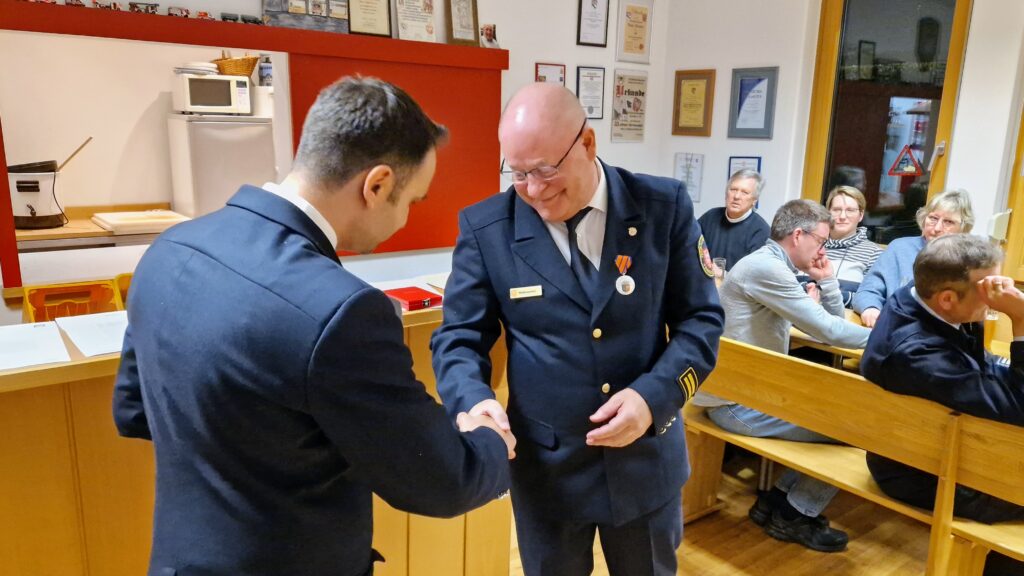 Im Programmpunkt 10 wurden von Stadtbrandinspektor Dirk Rübesamen und Wehrführer Bernhard Hahn Ehrungen und Beförderungen vorgenommen. Tim Hahn wurde zum Oberfeuerwehrmann befördert. Unser stellvertretender Wehrführer Thomas Lohmann erhielt eine Anerkennungsprämie des Hessischen Innenministeriums für 20 Jahre Feuerwehrdienst. Bernhard Hahn durfte Dirk Rübesamen anschließend doppelt ehren, mit der “Ehrenmedaille in Silber am Bande” des Nassauischen Feuerwehrverbandes und dem “Silbernen Brandschutzehrenzeichen am Bande” des Landes Hessen.