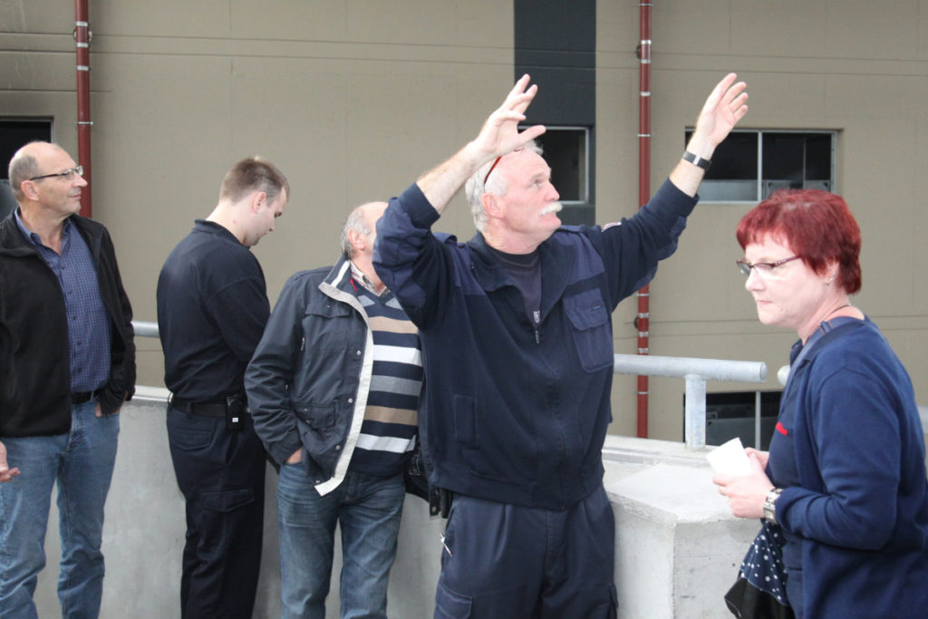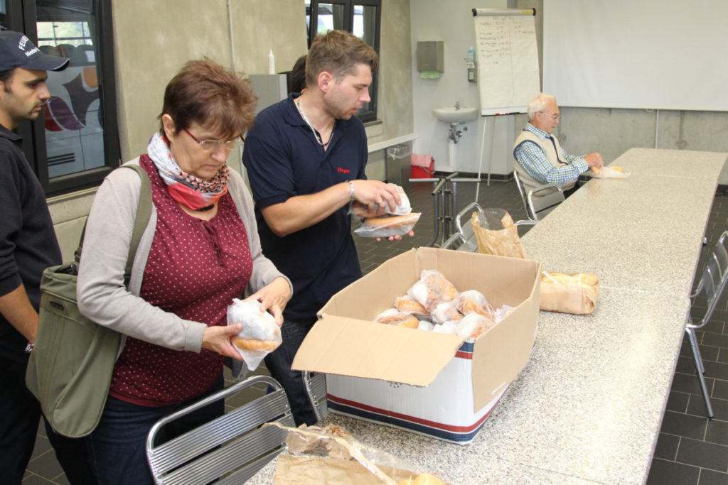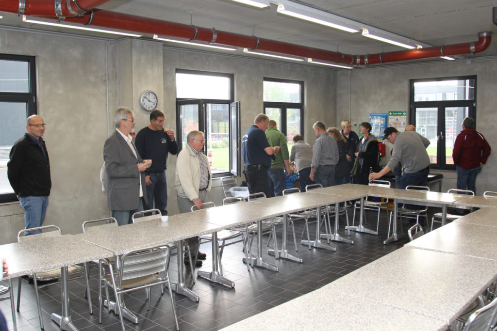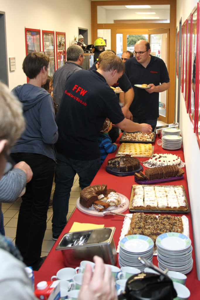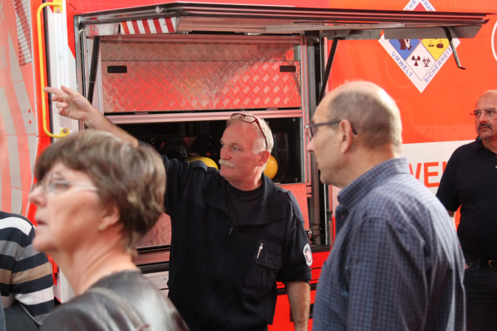 Vor dem nächsten Programmpunkt stärkten wir uns im FRTC mit Lunchpaketen. Anschließend ging es in den Osthafen zur Katastrophenschutzübung „Frankopia“. Eine Staffel unserer Wehr nahm daran teil, unsere Besucher konnten die Übung beobachten. Während unsere Kameraden noch eine sich aus dem Übungsszenario ergebende Dekontamination über sich ergehen lassen mussten, fuhren die Steigerwälder bereits zu unserem Feuerwehrhaus in der Kurmarkstraße. Bei Kaffee und einem riesigen Buffet mit diversen selbstgebackenen Kuchen wurde dann die ruhigere Phase des Besuchs eingeläutet mit privatem Austausch und natürlich auch ein wenig Fachsimpelei.