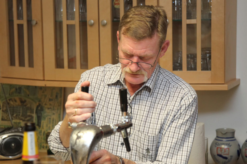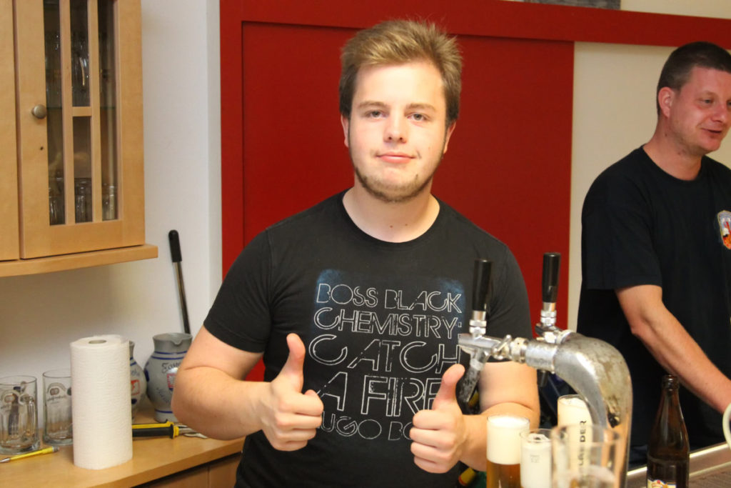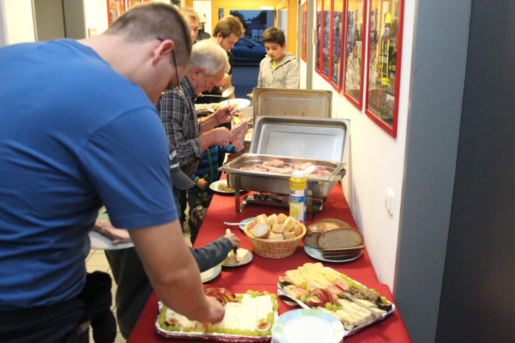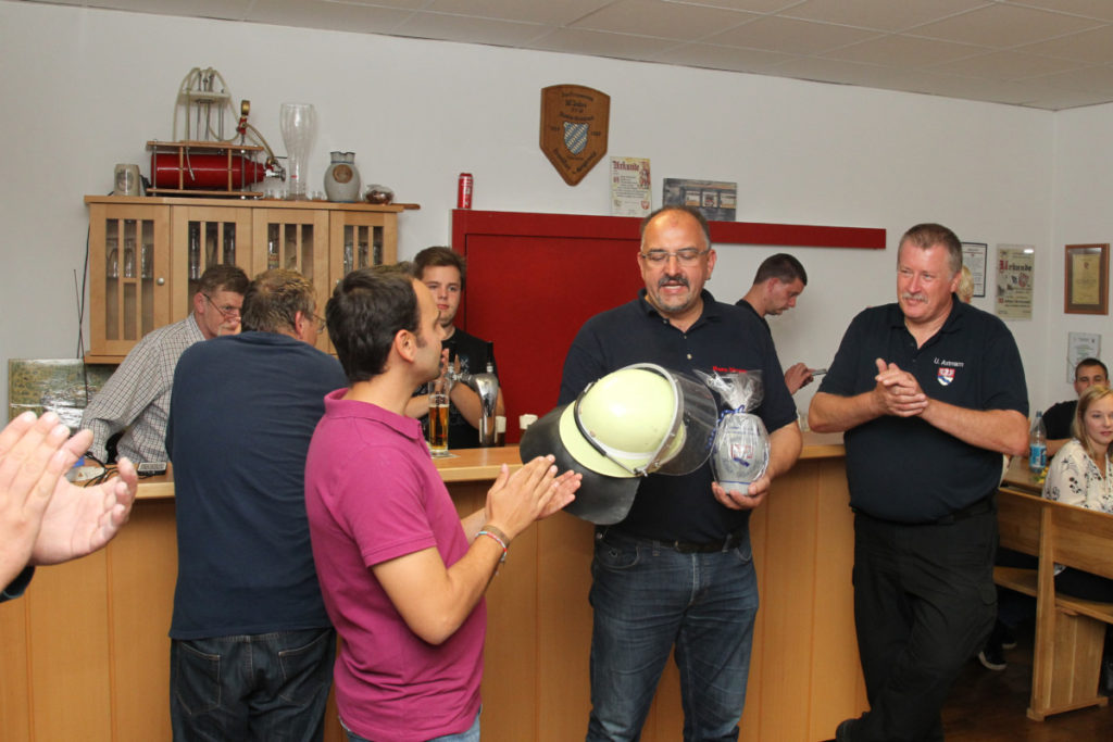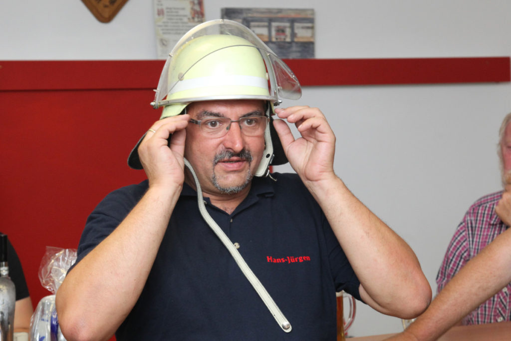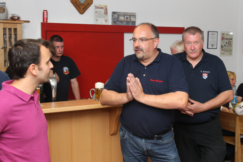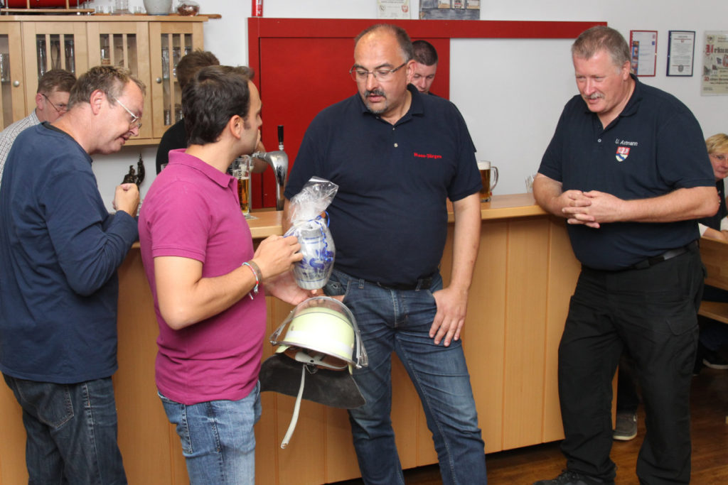 Kurz vor dem Abendessen trafen dann auch die Übungsteilnehmer ein, frisch dekontaminiert. Alle gemeinsam machten sich dann über das Buffet mit lokalen Spezialitäten her. Nach dem Mahl löste unser ehemaliger Stadtbrandinspektor Peter Kraft seine Wettschulden ein. Beim letzten Besuch der Steigerwälder Kameraden hatte er den genauen Termin des Geburtstags eines neuen Frankfurter Erdenbürgers vorhergesagt und damit – seiner Aussage nach zum allerersten Mal – danebengelegen.