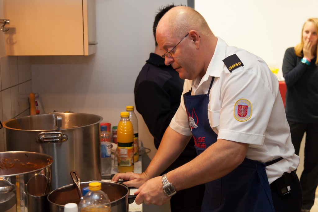 Nachdem alle weiteren Ehrungen für vieljähriges Engagement in der Freiwilligen Feuerwehr Frankfurt abgeschlossen waren, konnten sich die Geehrten und ihre Begleitungen am Buffet stärken, auf dem in diesem Jahr Tomaten-Consommé mit Croutons, frischer Salat, Burgunderbraten mit Soße, Geflügelgeschnetzeltes, Knödel und Nudeln angeboten wurde. Eine Quarkspeise mit Früchten stand zur Abrundung als Dessert bereit. Dirk Rübesamen, der federführende Chefkoch, heimste für seine Kreationen von diversen Seiten großes Lob ein.