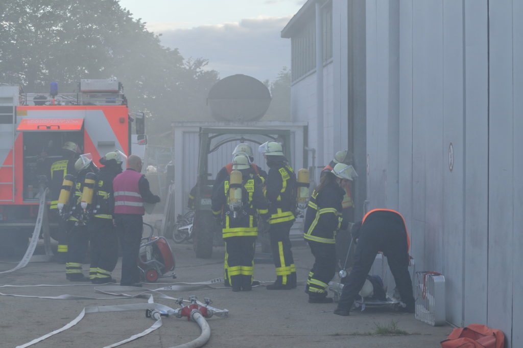 Direkt nach Ankunft wurde die Scheune durch den Angriffstrupp aus Nieder-Erlenbach durchsucht, während sich mehrere Trupps aus Ober-Erlenbach unter Atemschutz auf die Suche nach Verletzten in der Halle machten. In der Scheune wurde der Verletzte nach längerer Suche auf einem Heuboden gefunden und gerettet. Die Ober-Erlenbacher Trupps retteten währenddessen die anderen Verletzten aus der stark verrauchten Halle. Der Eingeklemmte konnte schließlich durch den Einsatz einer hydraulischen Winde in Gemeinschaftsarbeit befreit und zu den anderen Verletzten gebracht werden. Die Wasserversorgung wurde vom Ober-Erlenbacher TLF im Pendelverkehr sichergestellt. Nachdem alle Vermissten aufgefunden und die Brände erfolgreich gelöscht waren, wurden beide Liegenschaften mittels Lüftern vom Brandrauch befreit.
