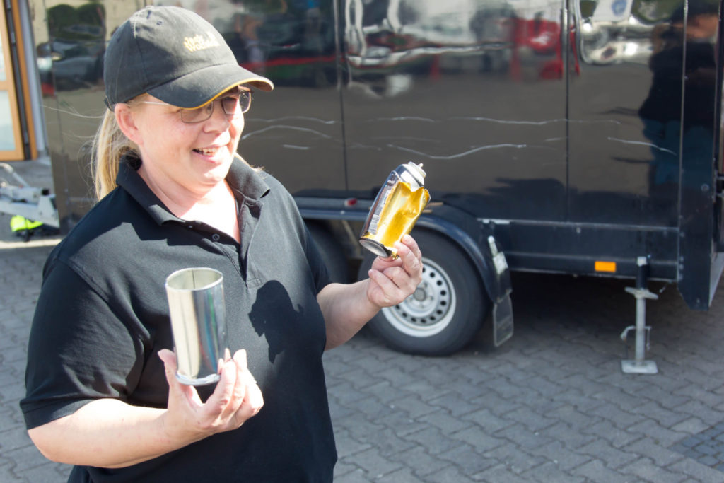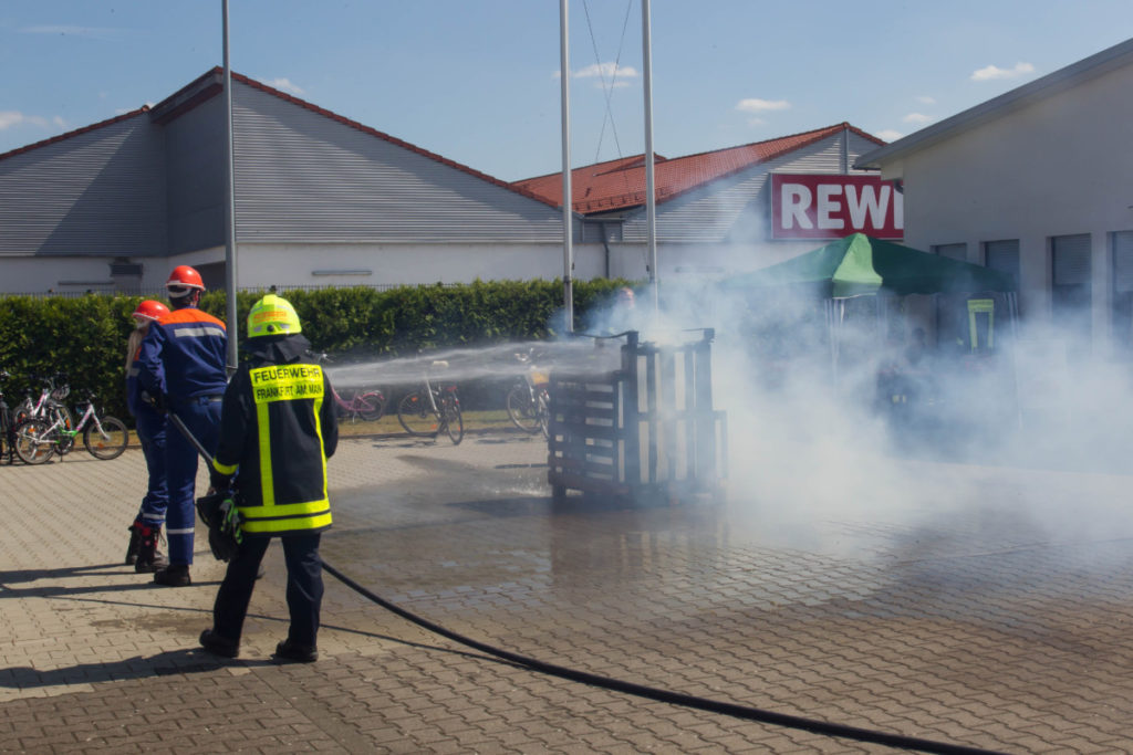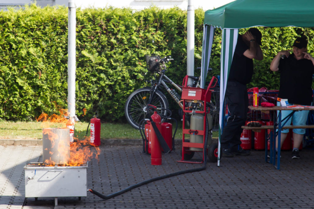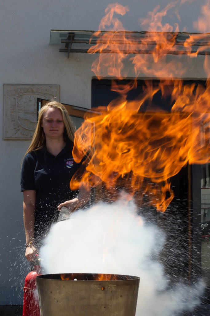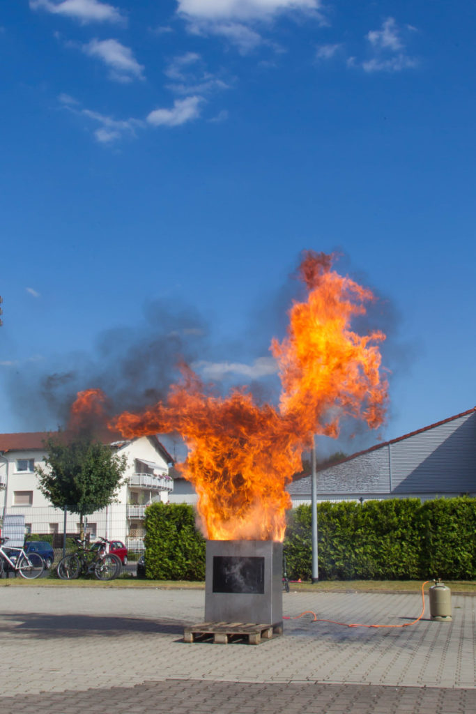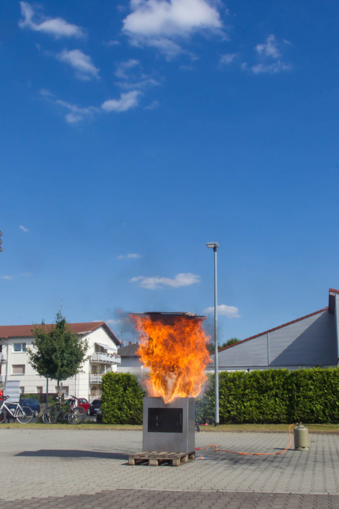 Ein weiteres Highlight war die Demonstration einer Fettexplosion. Die Größe des Feuerballs rief angesichts der kleinen dafür verwendeten Mengen von Öl und Wasser großes Erstaunen hervor. Anschließend zeigte der dumpfe Knall einer Explosion aus dem Feuerbecher vom Crash-Instructor-Team an, was passiert, wenn eine Sprühdose hohen Temperaturen, wie sie zum Beispiel im Sommer auch in Fahrzeugen auftreten können, ausgesetzt wird.