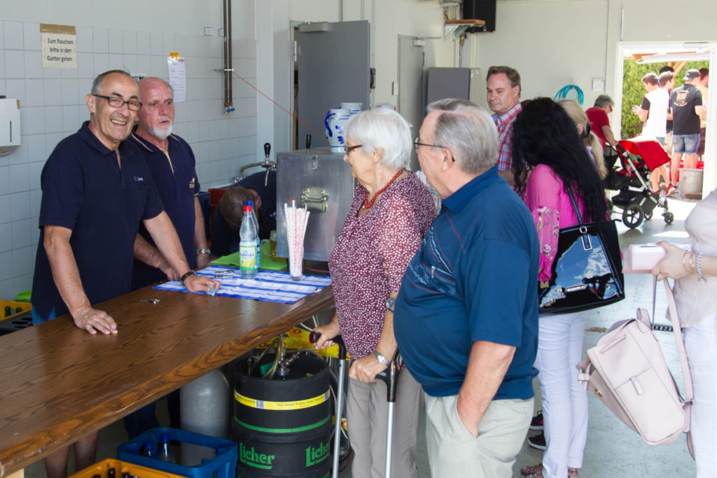 Aufgrund der hochsommerlichen Temperaturen war die Getränketheke eine beliebte Anlaufstelle. Zusammen mit einem Imbiß vom Grill und als Dessert einem Stück von den zahlreichen angebotenen Kuchen ließ es sich im Schatten der Halle hervorragend aushalten.