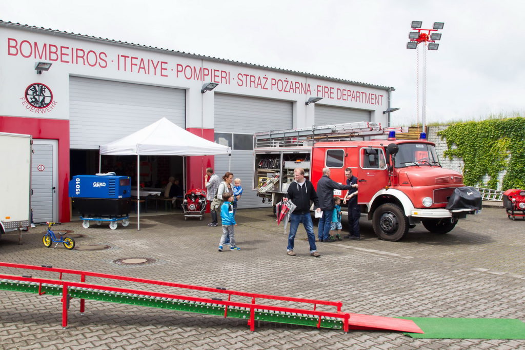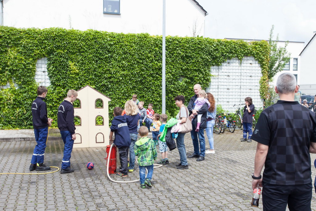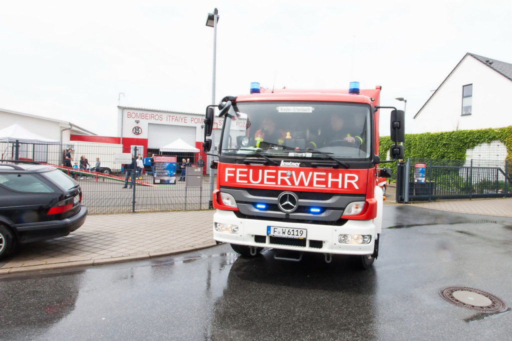 Aufgrund der unsicheren Wetterprognose für die folgenden Stunden mussten wir dann leider den Feuerlöscherstand und die Hüpfburg für Kinder absagen. Zwischen 11 Uhr und 12 Uhr klarte sich der Himmel dann langsam auf und ließ sogar einige Sonnenstrahlen hindurchblitzen. Als dann die Sonne eine stetig größer werdende Schar von Besuchern angelockt hatte, kündigte sich die nächste Herausforderung an: Um Punkt 11:57 Uhr alarmierte uns die Leitstelle Frankfurt. In Enkheim hatte der Starkregen noch bei weitem stärker gewütet als bei uns, eine Vielzahl an Notrufen war die Folge.