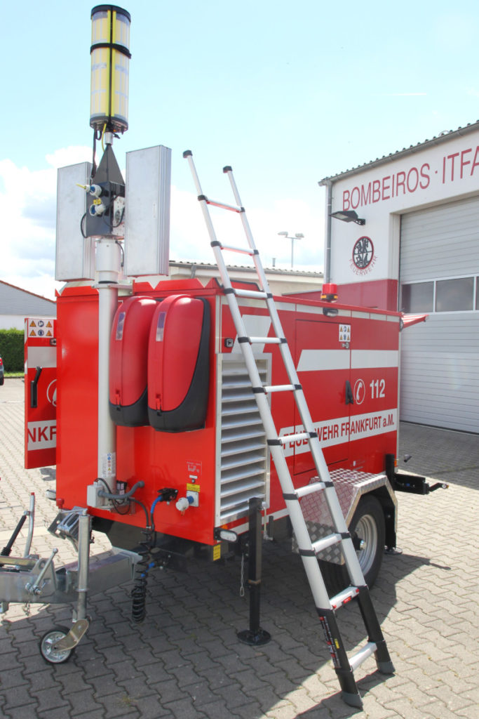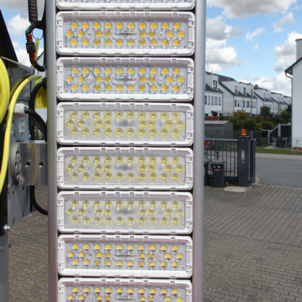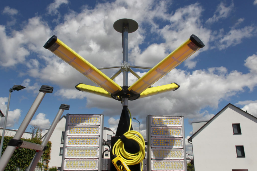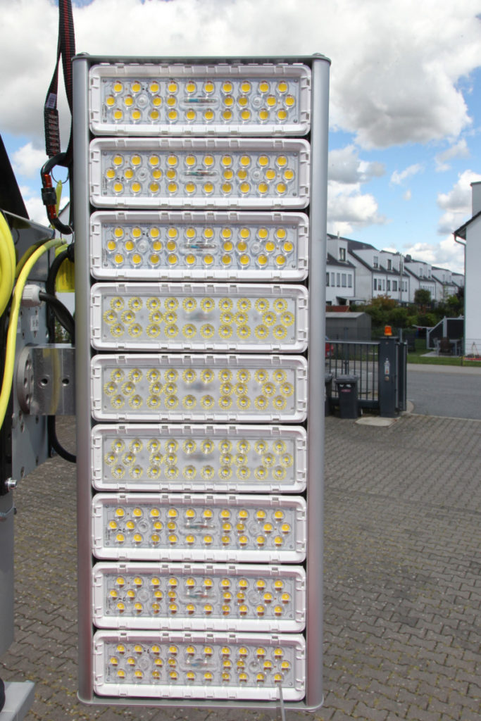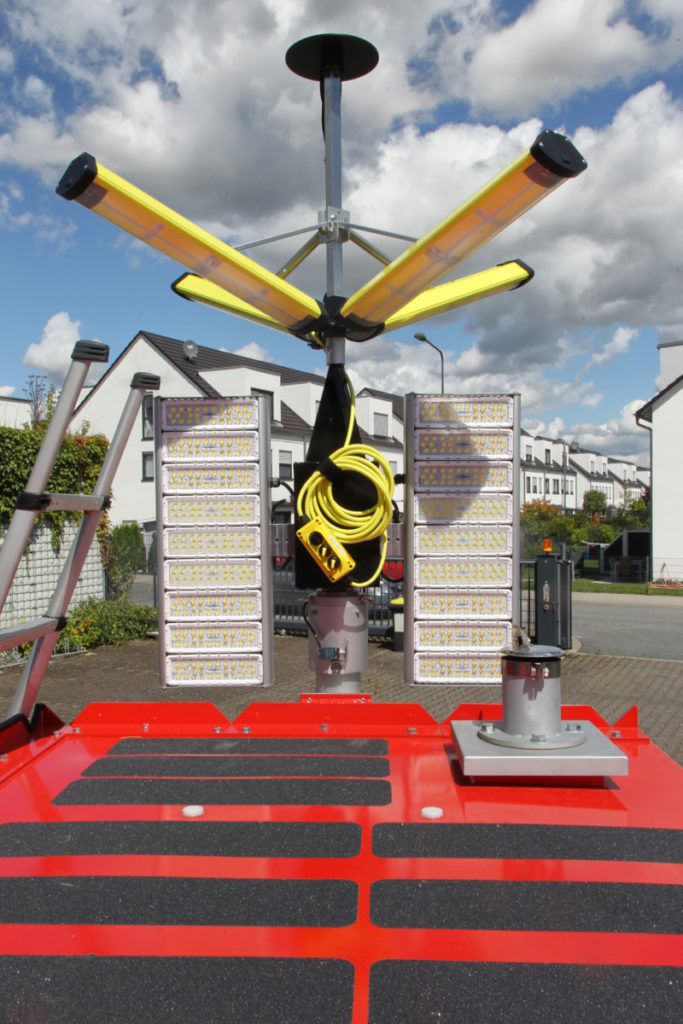 Das Dach des Anhängers ist komplett begehbar und kann mit der mitgeführten Teleskopleiter erreicht werden. Wenn der Aldebaran 360 Grad-Leuchtkörper eingesetzt werden soll, wird er vor dem Ausfahren des Mastes aufgesteckt. Die vier LED-Panels des Leuchtkörpers können in verschiedenen Stellungen arretiert werden. Je nach Neigung wird ein kleinerer oder größerer Bereich der Umgebung ausgeleuchtet. Diverse am Anhänger angebrachte Umfeldlichter können bereits vor dem Einschalten batteriegespeist für Licht sorgen, was den Aufbau bei Dunkelheit vereinfacht.
