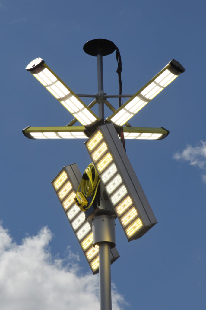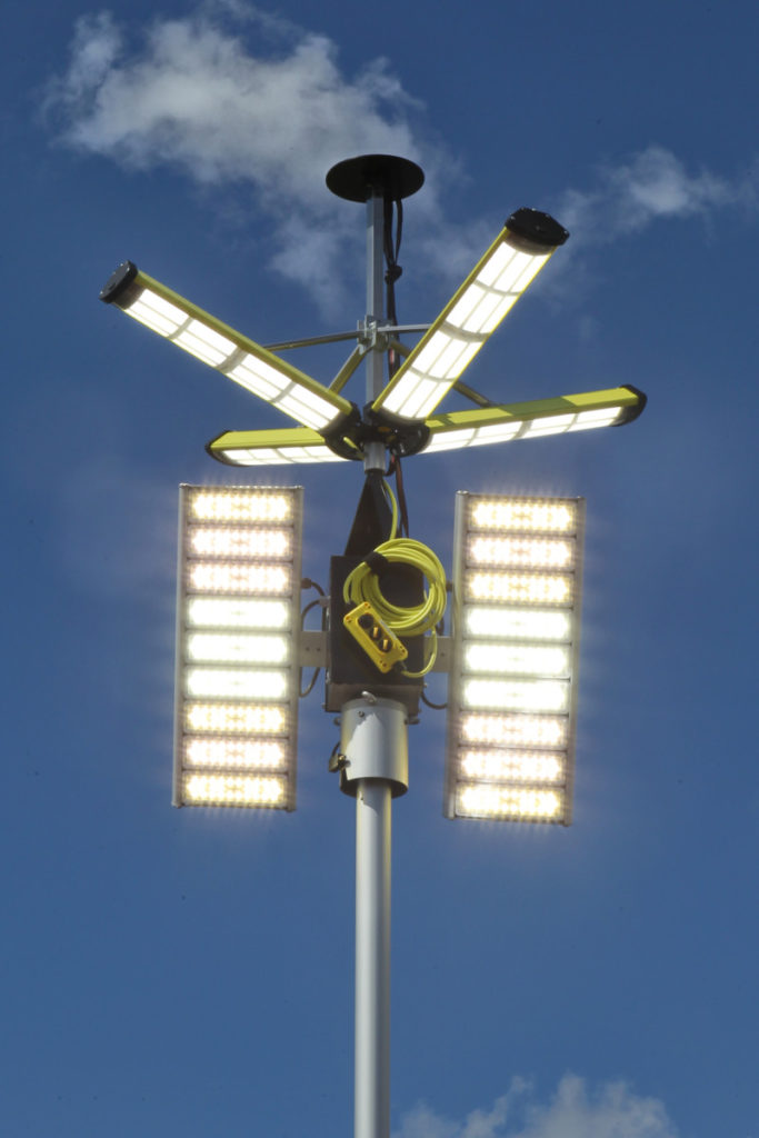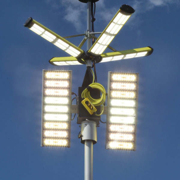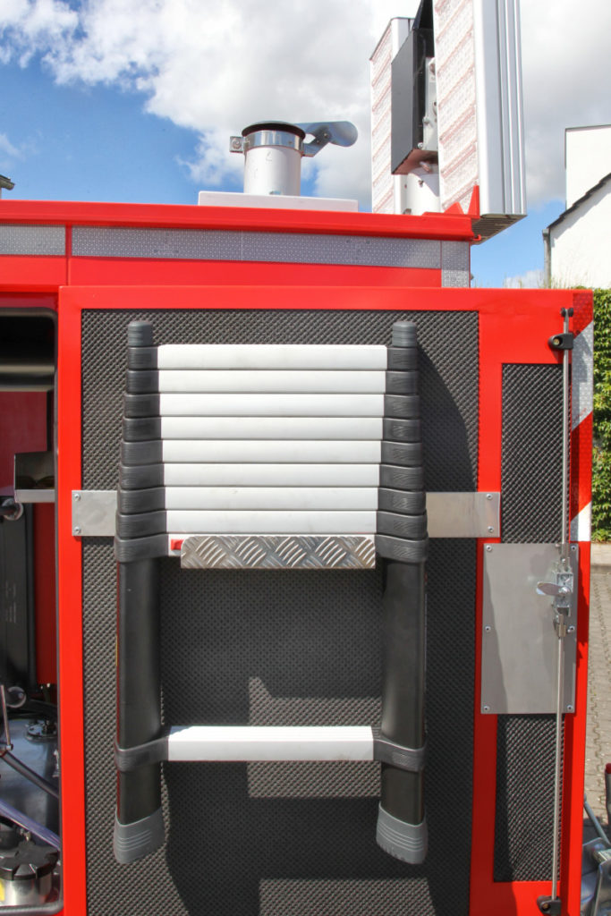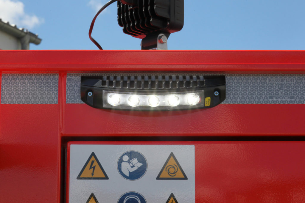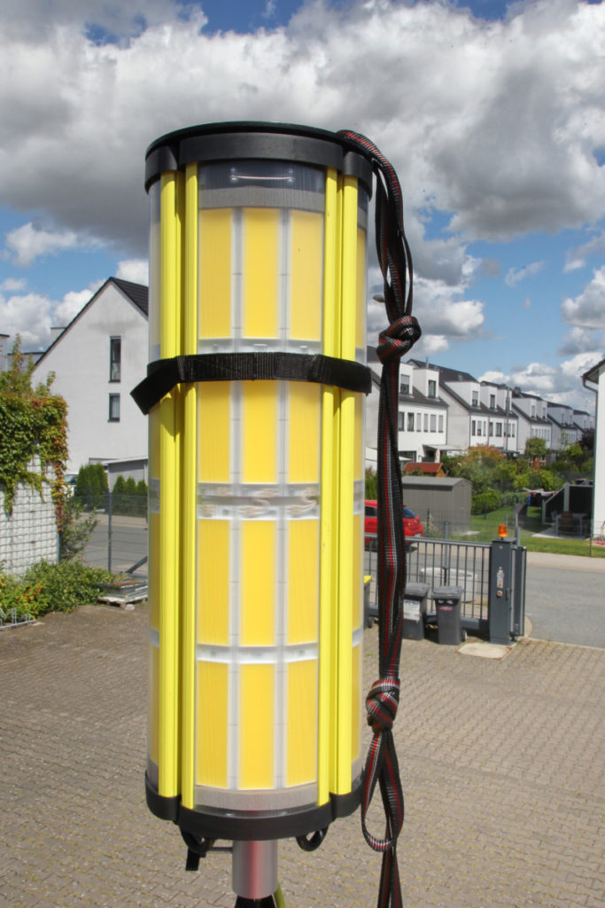 Das Dach des Anhängers ist komplett begehbar und kann mit der mitgeführten Teleskopleiter erreicht werden. Wenn der Aldebaran 360 Grad-Leuchtkörper eingesetzt werden soll, wird er vor dem Ausfahren des Mastes aufgesteckt. Die vier LED-Panels des Leuchtkörpers können in verschiedenen Stellungen arretiert werden. Je nach Neigung wird ein kleinerer oder größerer Bereich der Umgebung ausgeleuchtet. Diverse am Anhänger angebrachte Umfeldlichter können bereits vor dem Einschalten batteriegespeist für Licht sorgen, was den Aufbau bei Dunkelheit vereinfacht.
