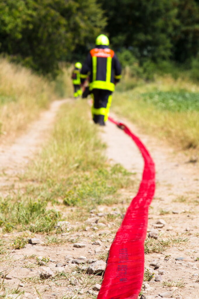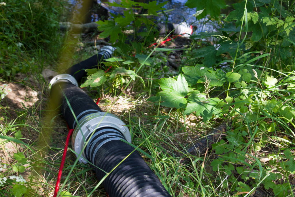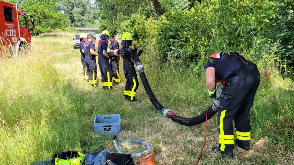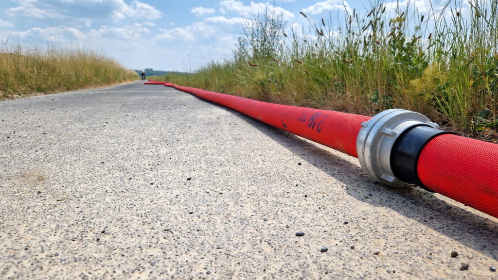 Zur Versorgung der Einheiten mit Löschwasser wurden eine Wasserentnahmestelle am Erlenbach aufgebaut und Schläuche über eine längere Wegstrecke zu den Einsatzfahrzeugen an den Brandort verlegt.
