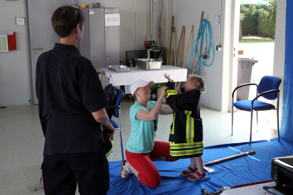 Wie jedes Mal nutzten viele junge aber auch ältere Besucher die Möglichkeit, sich unsere Fahrzeuge und auch die anderen technischen Einsatzmittel näher ansehen zu können. Angesichts der heißen Temperaturen war die Löschwand besonders beliebt, wobei häufig die Feuerwehrleute in spe nasser wurden als das zu löschende Hausmodell. Die Abkühlung hat bestimmt nicht geschadet.
