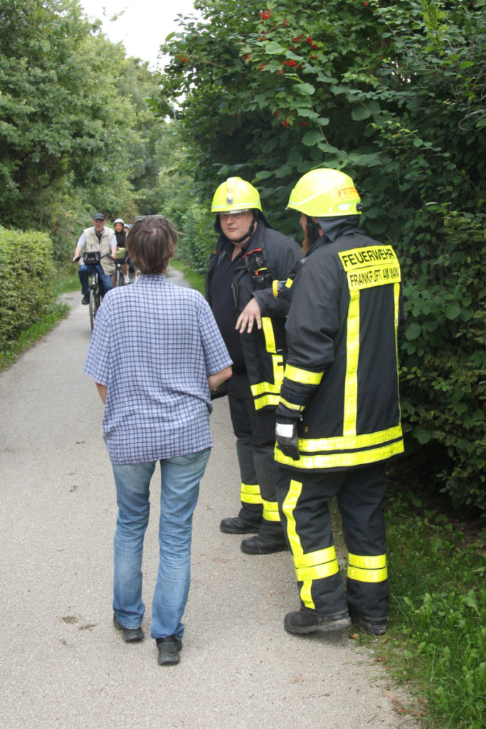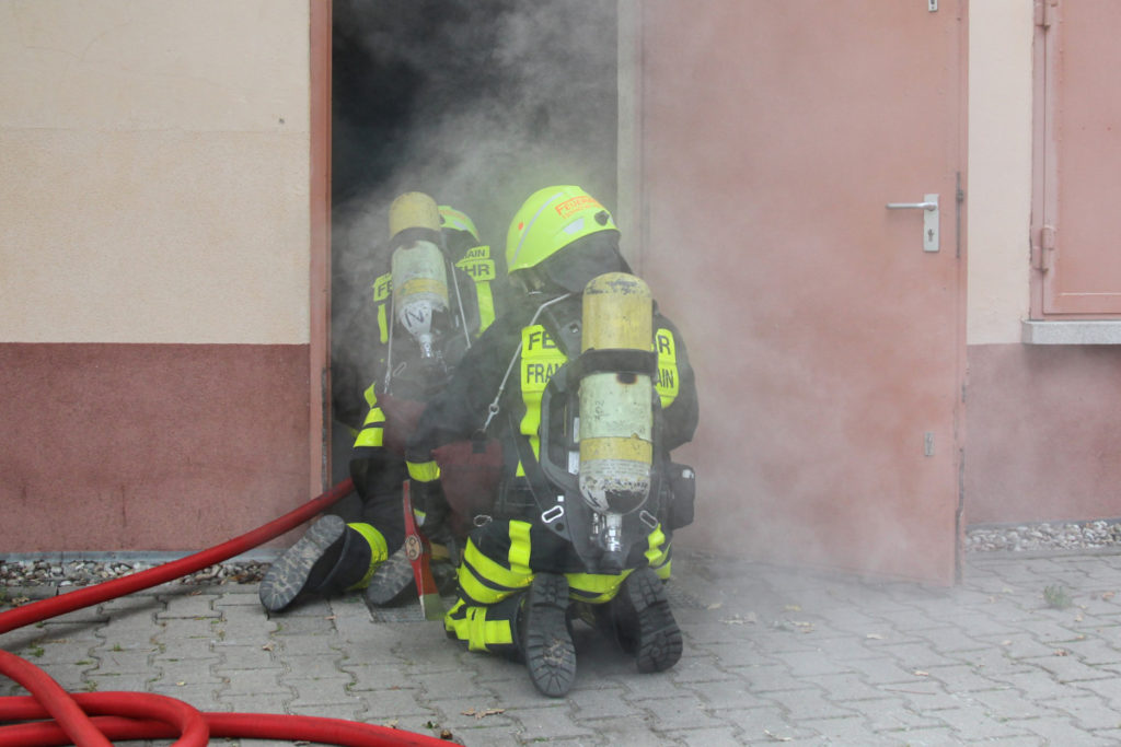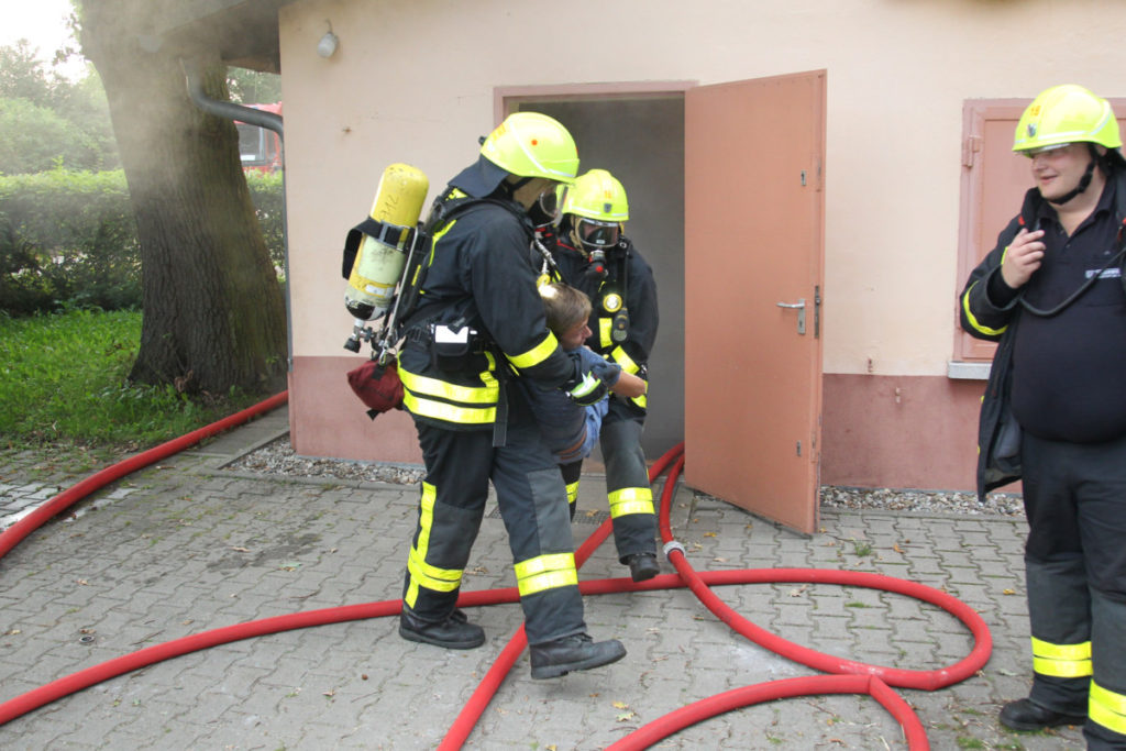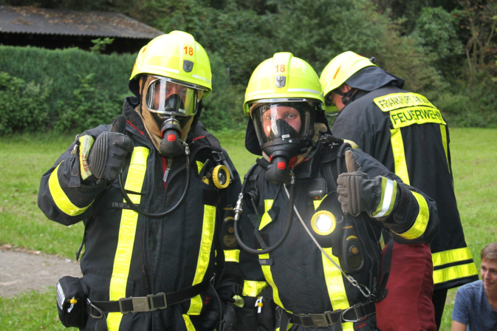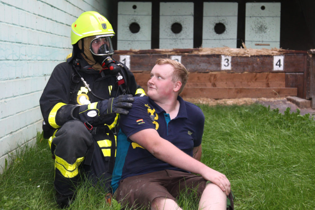 Nach kurzer Zeit konnte bereits der erste bewusstlose Jugendliche gefunden und ins Freie verbracht werden. Nachdem bei der Suche eine kleine Brandstelle aufgefunden und gelöscht wurde, konnten die beiden Trupps noch zwei weitere Bewusstlose auffinden und retten. Nachdem das Vereinsheim abgesucht worden war, wurde auf der Schießbahn ein vierter Jugendlicher aufgefunden, der leichte Kopfverletzungen aufgrund eines Sturzes erlitten hatte. Um ihm eine Rettung per Leiter über die Mauer zu ersparen, wurde der Brandrauch mit einem Lüfter aus dem Vereinsheim gedrückt und so die Möglichkeit geschaffen, ihn ebener Erde zu den anderen Geretteten zur Verletztenablage zu bringen. Eine weitere Feuerstelle auf der Schießbahn wurde abgelöscht. Mit der Meldung „Feuer aus“ und der Rettung aller Vermissten war die Übung dann erfolgreich beendet.