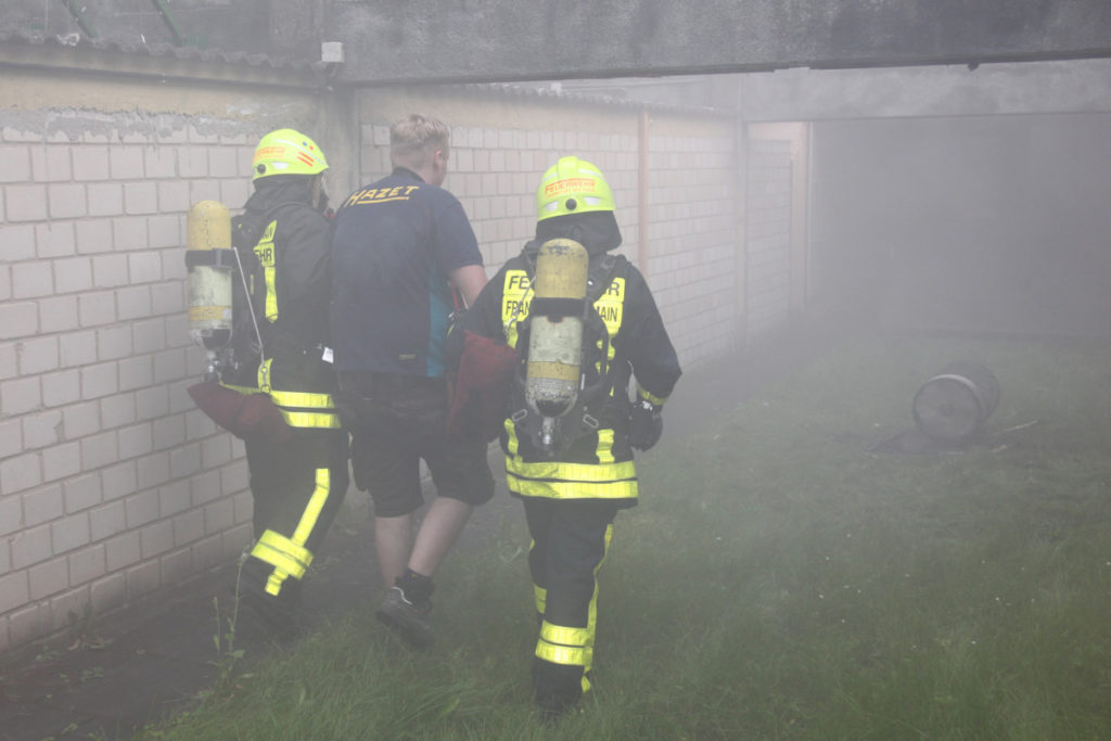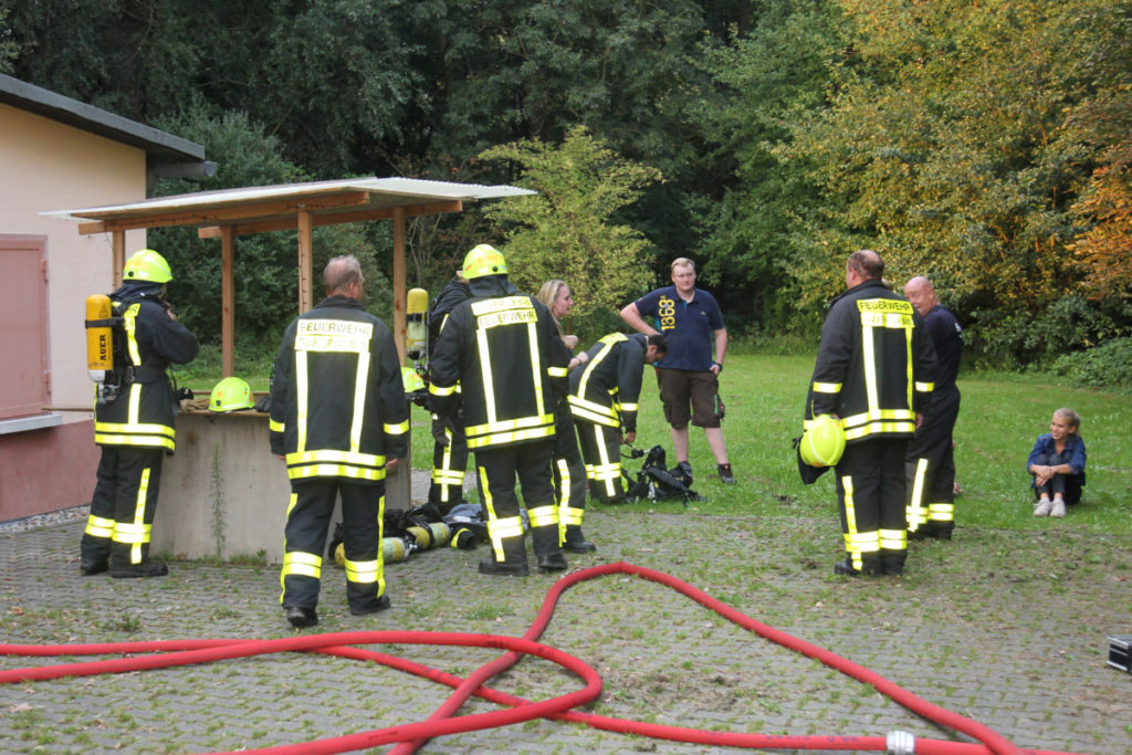 Nach dem Eintreffen verschaffte sich Gruppenführer Thomas Lohmann zuerst einen Überblick über die Lage. Die aufgeregte Nachbarin berichtete von einigen Jugendlichen, die sie in das Gebäude gehen sah. Der Angriffstrupp wurde daraufhin unter Atemschutz in das Vereinsheim entsendet, um die Verschwundenen zu suchen und gegebenenfalls zu retten. Bedingt durch die angetroffene starke Rauchentwicklung in den Räumlichkeiten und die damit verbundene große Gefahr, wurde der Wassertrupp ebenfalls zur Menschenrettung abkommandiert.