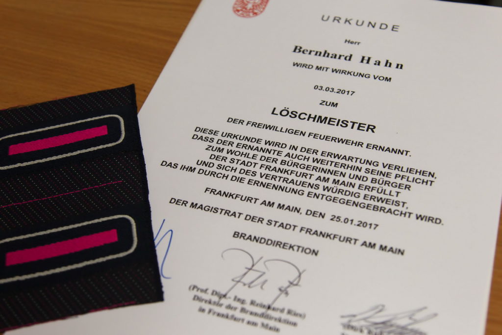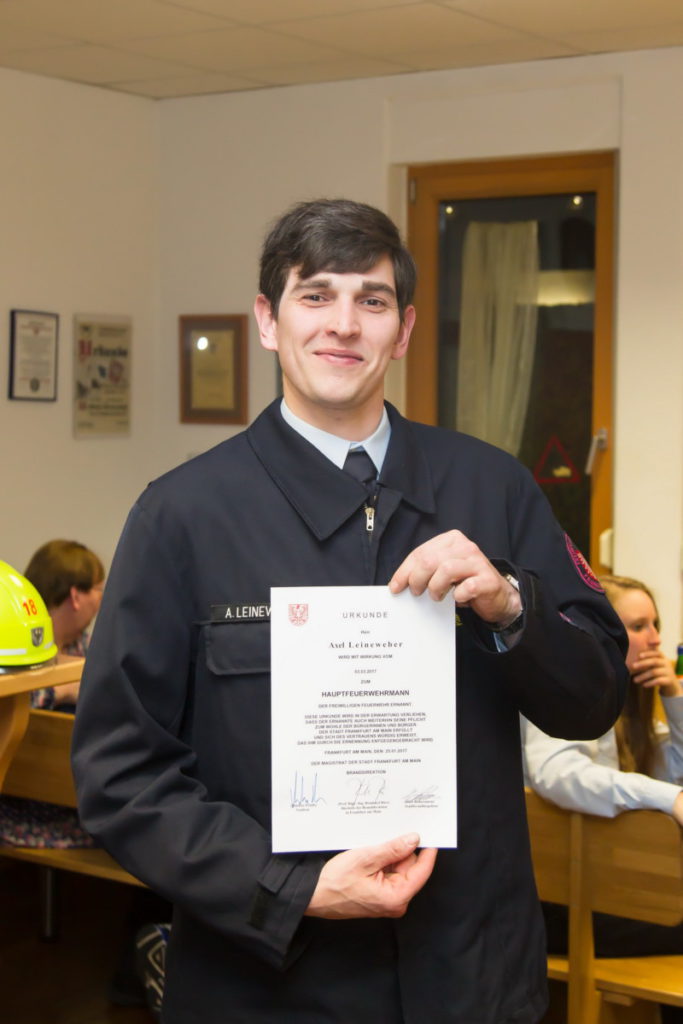 Danach wurden unser Kamerad Axel Leineweber zum Hauptfeuerwehrmann und Wehrführer Hahn zum Löschmeister befördert. Beide Beförderungen nahm Stadtbrandinspektor Rübesamen vor. Axel durfte dann direkt noch einmal vor die Versammlung treten, er bekam von Rübesamen für seine stetige Unterstützung, zuletzt bei den Veranstaltungen zum Abschied vom stellvertretenden Stadtbrandinspektors Gunter Renner und von Stadtbrandinspektor Peter Kraft, die „Ehrenauszeichnung in Bronze am Bande für besondere Verdienste im Feuerwehrwesen“ verliehen.