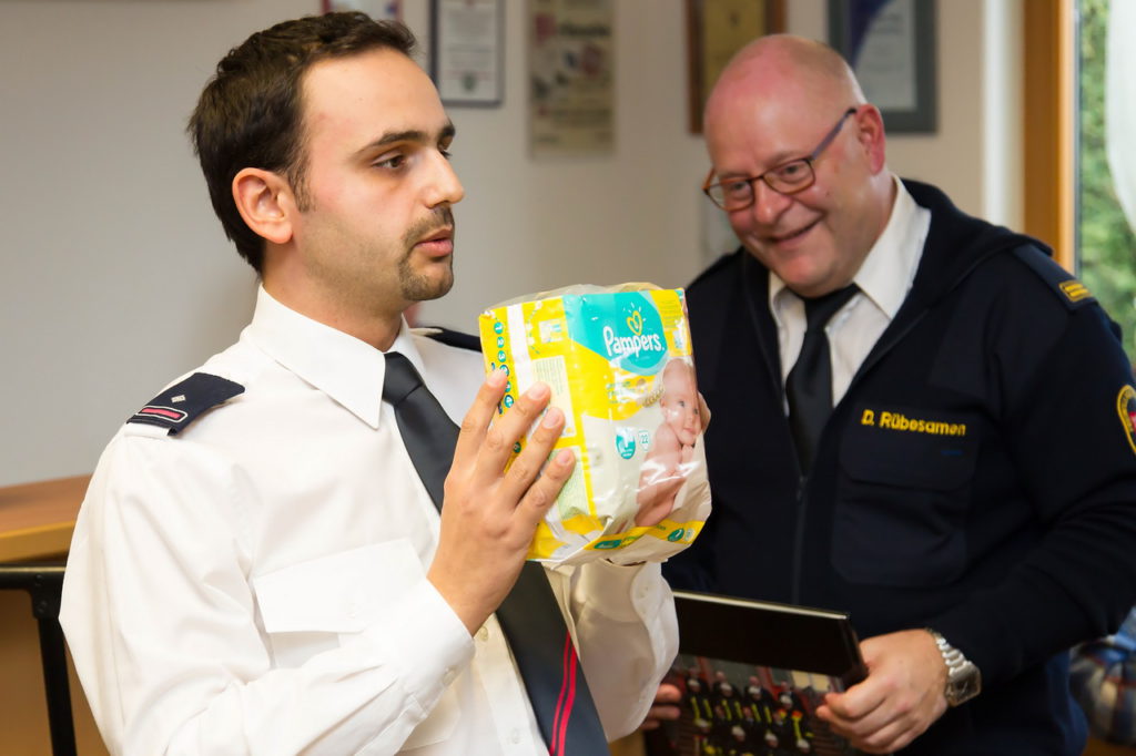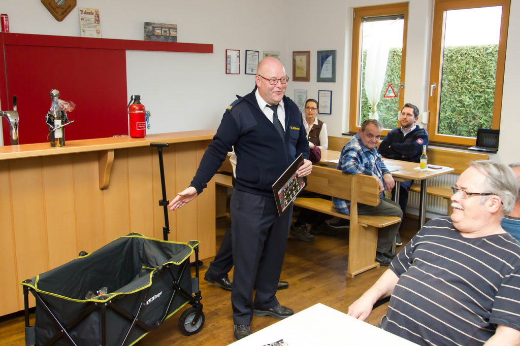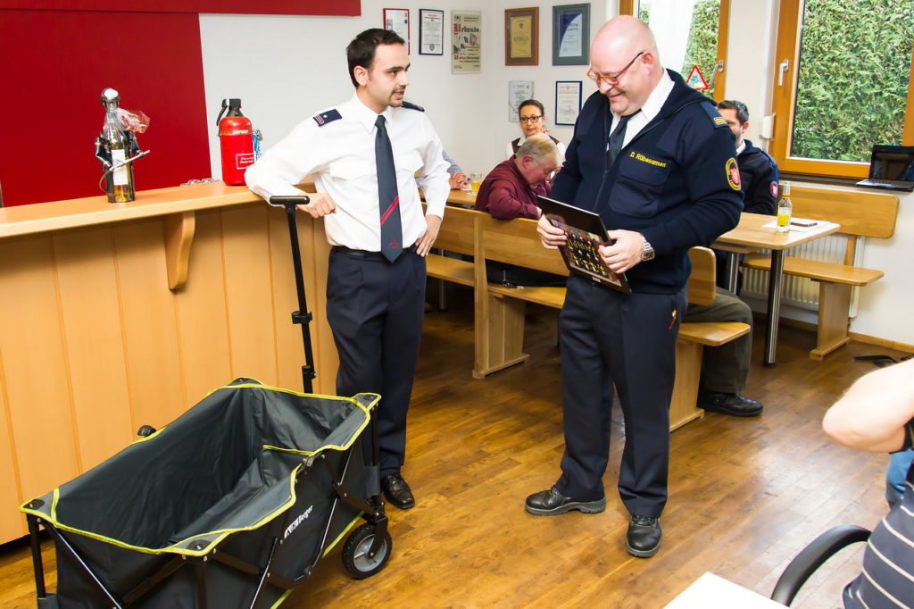Zuletzt bedankte sich Bernhard Hahn ganz herzlich bei Dirk Rübesamen für seine Arbeit als Wehrführer. Als Zeichen der Wertschätzung und des Dankes wurden ihm von der Einsatzabteilung, der Alters- und Ehrenabteilung und vom Verein ein faltbarer Bollerwagen mit Utensilien für den sich ankündigenden Familienzuwachs, eine Flasche Wein mit feuerwehrtechnisch stilechtem Flaschenhalter sowie ein Buch mit vielen Fotos aus seiner Zeit als Feuerwehrmann in der Freiwilligen Feuerwehr Nieder-Erlenbach überreicht.