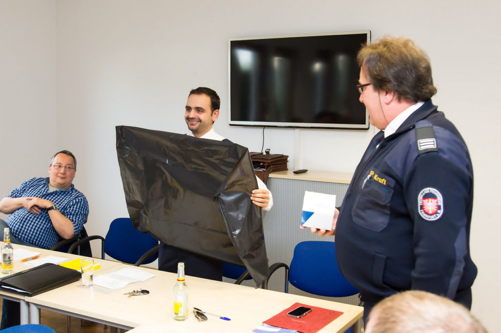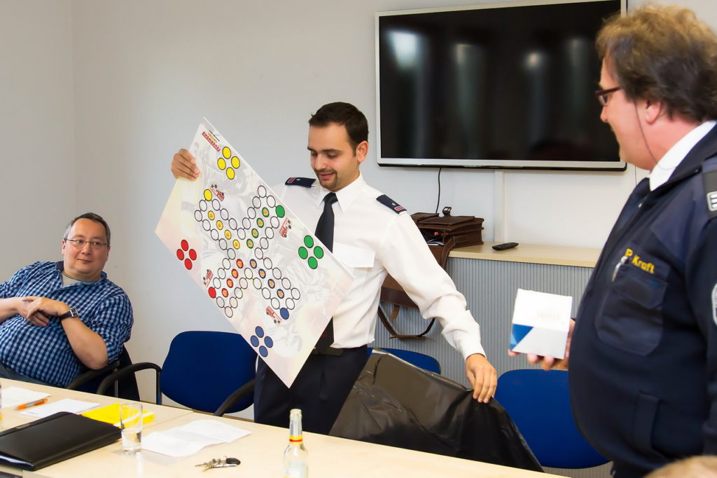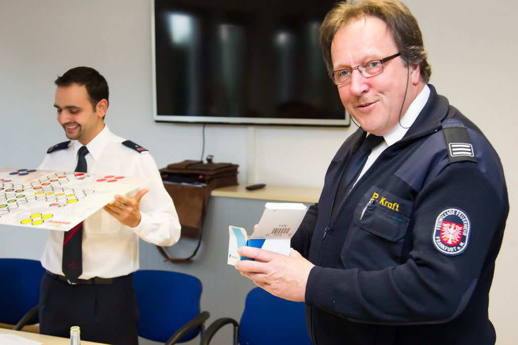 Von Peter Kraft, dem frischgebackenen Stadtbrandinspektor a.D., wurde der Freiwilligen Feuerwehr Nieder-Erlenbach als Dankeschön für das langjährige Engagement bei der Durchführung von Veranstaltungen des Kreisfeuerwehrverbandes anschließend noch ein Überraschungspräsent überreicht: Ein „Feuerwehr-Mensch ärgere Dich nicht“ soll uns vor Langeweile bewahren, falls sein Nachfolger Dirk Rübesamen uns zukünftig in dieser Hinsicht nicht mehr so intensiv fordern sollte, wie er es getan hat. Vielen Dank, Peter, wir werden sehen, ob dies wirklich notwendig werden wird!