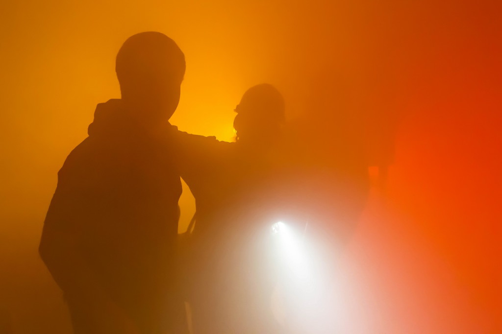 Wie bereits vorher vielfach geübt, baute unsere Jugendfeuerwehr einen Löschangriff auf. Parallel wurde das Löschgruppenfahrzeug gegen den fließenden Verkehr gesichert. Der Angriffstrupp musste sich auf der Suche nach Verletzten langsam vorarbeiten, die Sicht war durch Brandrauch stark beeinträchtigt (siehe Fotostrecke). Kurze Zeit später unterstützte der Wassertrupp beim Absuchen der Räumlichkeiten. Zwei Verletzte konnten gefunden und gerettet werden. Der Brand, der durch einen Kurzschluß im Mischpult des DJs ausgelöst wurde, konnte anschließend schnell gelöscht werden.