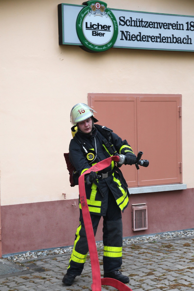 Spaziergänger und mitspazierende Hunde staunten nicht schlecht, als am vergangenen Donnerstagabend auf einmal heller Rauch aus dem Haus des Nieder-Erlenbacher Schützenvereins waberte. Einzig die Anwesenheit einiger Feuerwehrleute bevor es rauchte, war ein Hinweis darauf, dass es sich um eine Übung handelte. Kurze Zeit später rückte dann auch bereits die Nieder-Erlenbacher Feuerwehr mit den beiden Löschfahrzeugen an, und die Übung konnte beginnen.