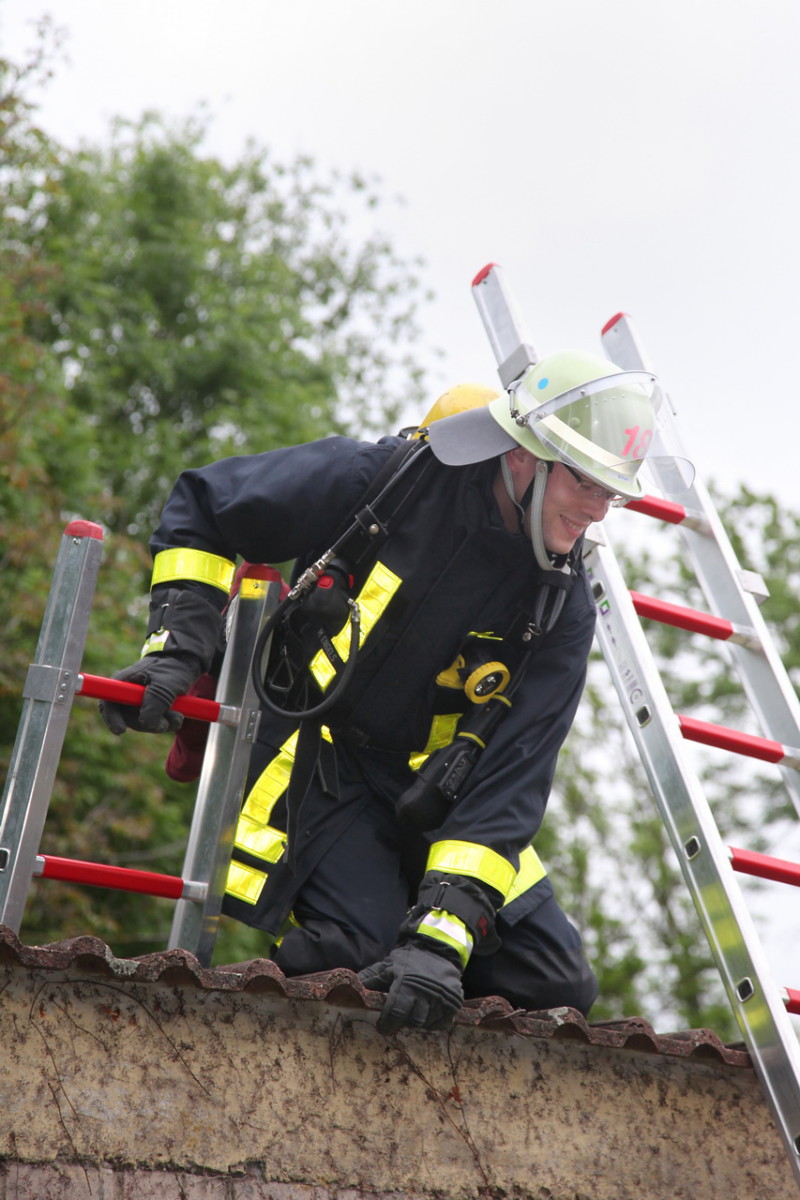 Angenommenes Szenario war ein Brand im Hauptteil des Schützenhauses. Zwei Anwesende konnten sich nach Ausbruch des Feuers gerade noch auf die Schießbahn retten, waren dort aber zwischen den hohen Wänden eingesperrt. Als die Feuerwehr eintraf, machten sie sich laut bemerkbar. Während vom ersten Fahrzeug aus die Menschenrettung übernommen wurde, begannen die weiteren Einsatzkräfte einen Löschangriff mit zwei Rohren auf das brennende Gebäude. Über zwei Steckleiterteile wurde die Wand der Schießbahn überwunden und ein Trupp begab sich zu den Eingeschlossenen. Glücklicherweise waren diese nicht verletzt und konnten sich mit Hilfe der Einsatzkräfte über die Leiter retten. Währenddessen gelang es auch, den Brand des Hauptgebäudes erfolgreich zu bekämpfen. Nach dem „Feuer aus!“ wurde das Gebäude noch belüftet, um die Reste des (Nebelmaschinen-) Rauchs aus den Räumlichkeiten zu entfernen.