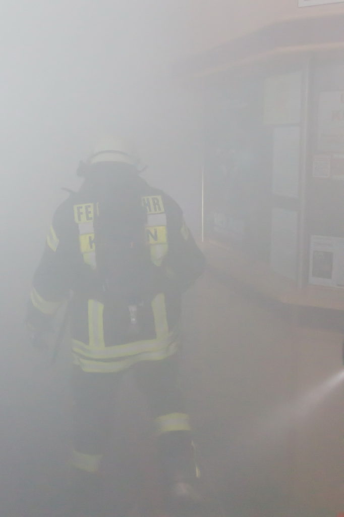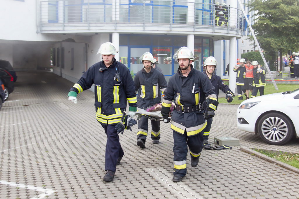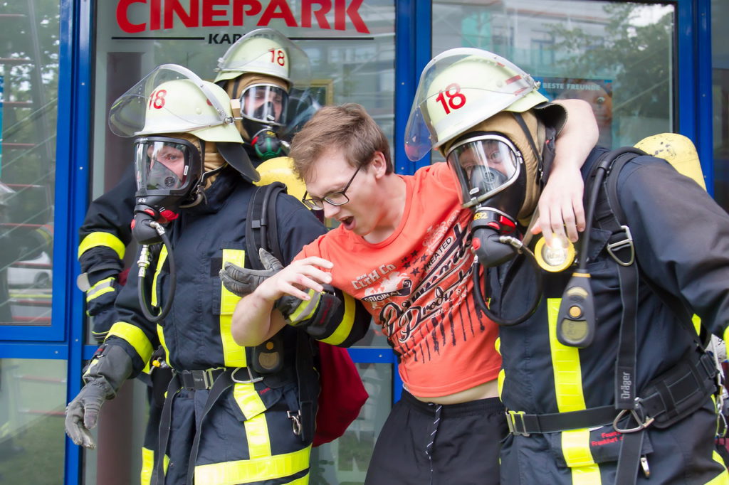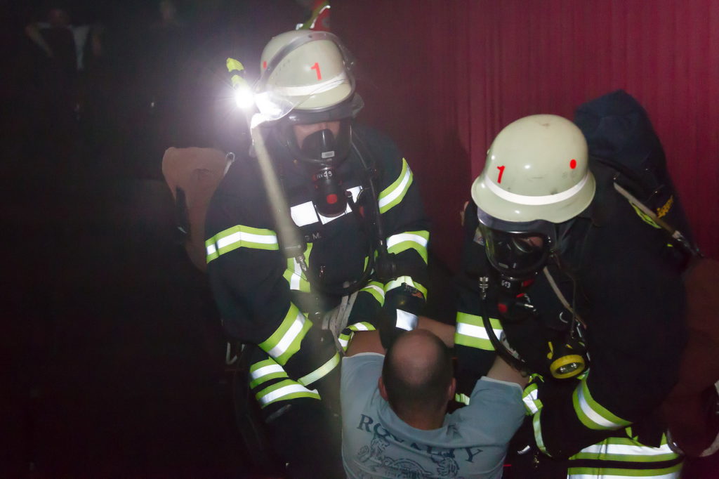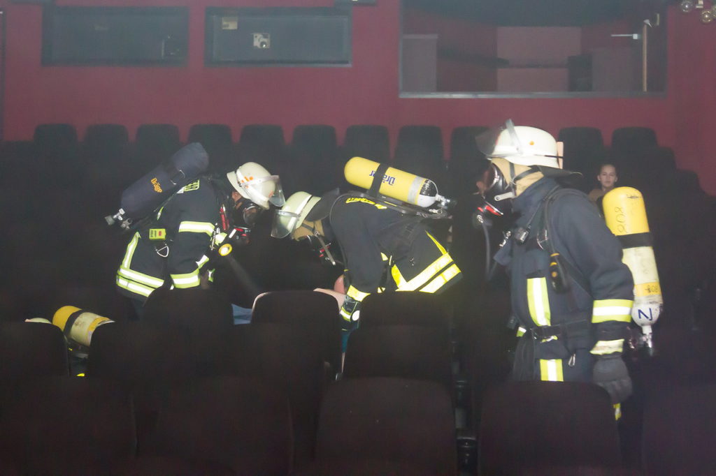 Nachdem das Foyer geräumt und das Feuer im Büro bekämpft war, gingen die Einsatzkräfte in den Kinosaal vor. Gehfähige Patienten wurden mit Unterstützung nach draußen verbracht, bewusstlose oder schwerer verletzte Betroffene wurden mit Tragen oder Tragetüchern gerettet. Nach einer knappen Stunde waren alle Verletzten in Sicherheit und versorgt und die Übung konnte beendet werden.